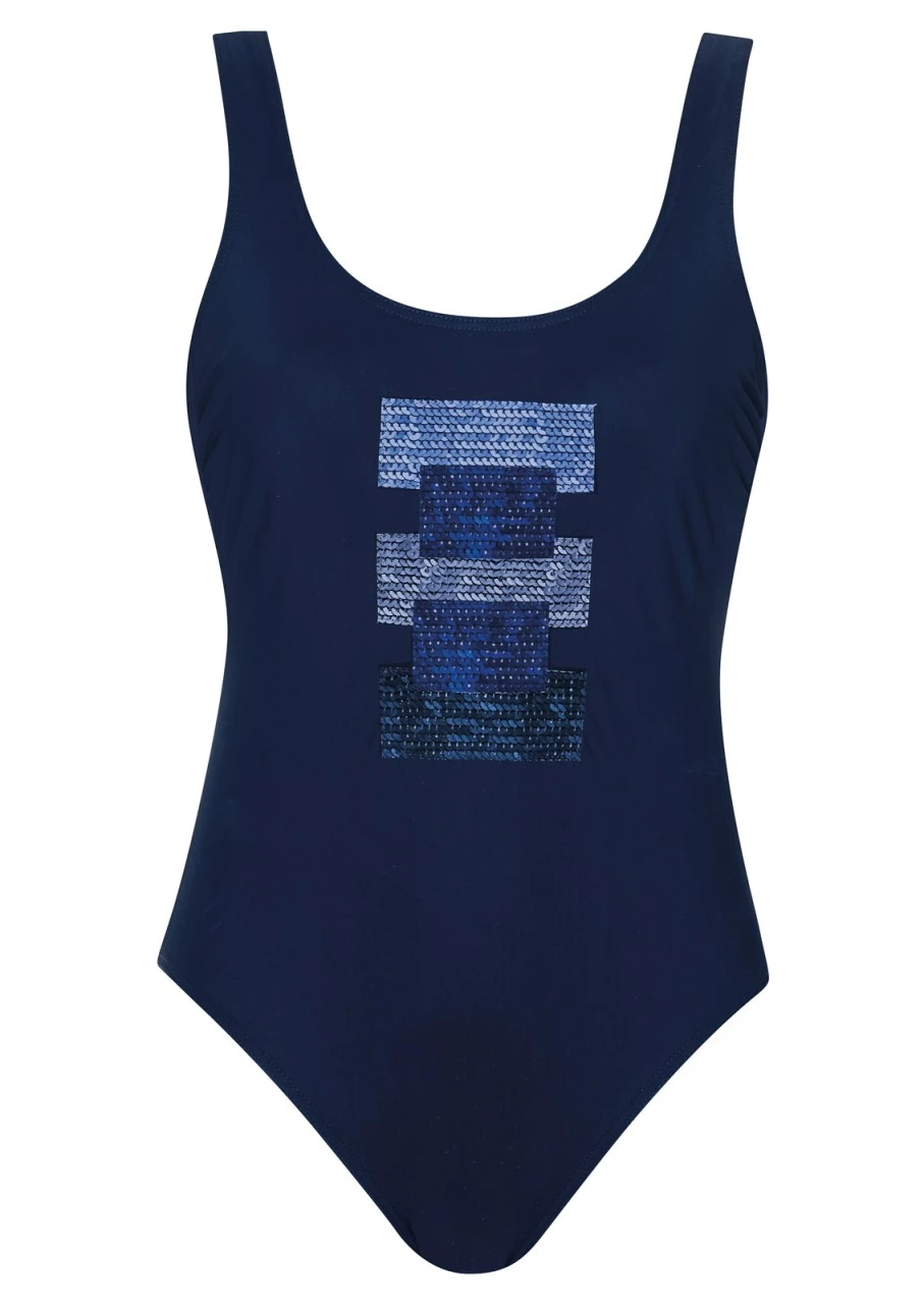 Kräftige Querstreifen in verschiedenen Blautönen in Kombination mit zierlichem Druck von aufgereihten Pailletten ergeben eine ganz junge und frische Optik. Sportlicher Badeanzug in Dunkelblau mit Softschalen und feiner Applikation an der Vorderseite.