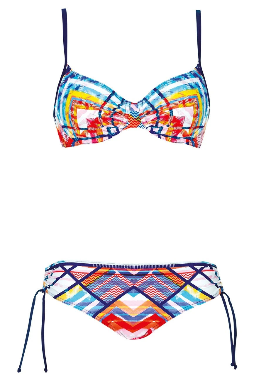 Man nehme einen weißen Untergrund, klare Grafik, frische Farben und nehme alles zusammen nicht so ernst. Dann entsteht dieses junge, freche Design! Bikini mit Formbügel und Petticoatstütze – diese sorgen für Halt beim Schwimmen. Die Träger sind verstellbar. Der seitlich höhenverstellbare Slip bietet Tragekomfort und kann an den Seiten gebunden werden.