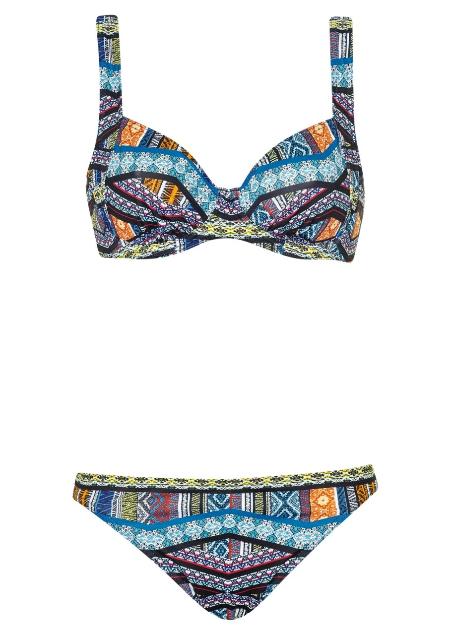 Filigraner Print mit Ethno-Anklängen. Ein tolles Design für schöne Bademode. Bequemer Bikini mit Formbügel und Petticoatstütze. Die breiten Träger sind verstellbar und zum Aushaken. Die süße Hüfthose mit schmalem Hosenbund vervollständigt den Bikini.