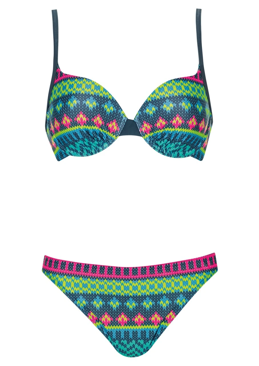 Multicolorful neu definiert. Die Anordnung an einem kräftigen Pink, dunklen Blau und zarten Rot- und Grüntönen, gemixt mit einem außergewöhnlichen Muster. Bikini mit Formbügel, Softschalen und verstellbaren Trägern zum Aushaken.