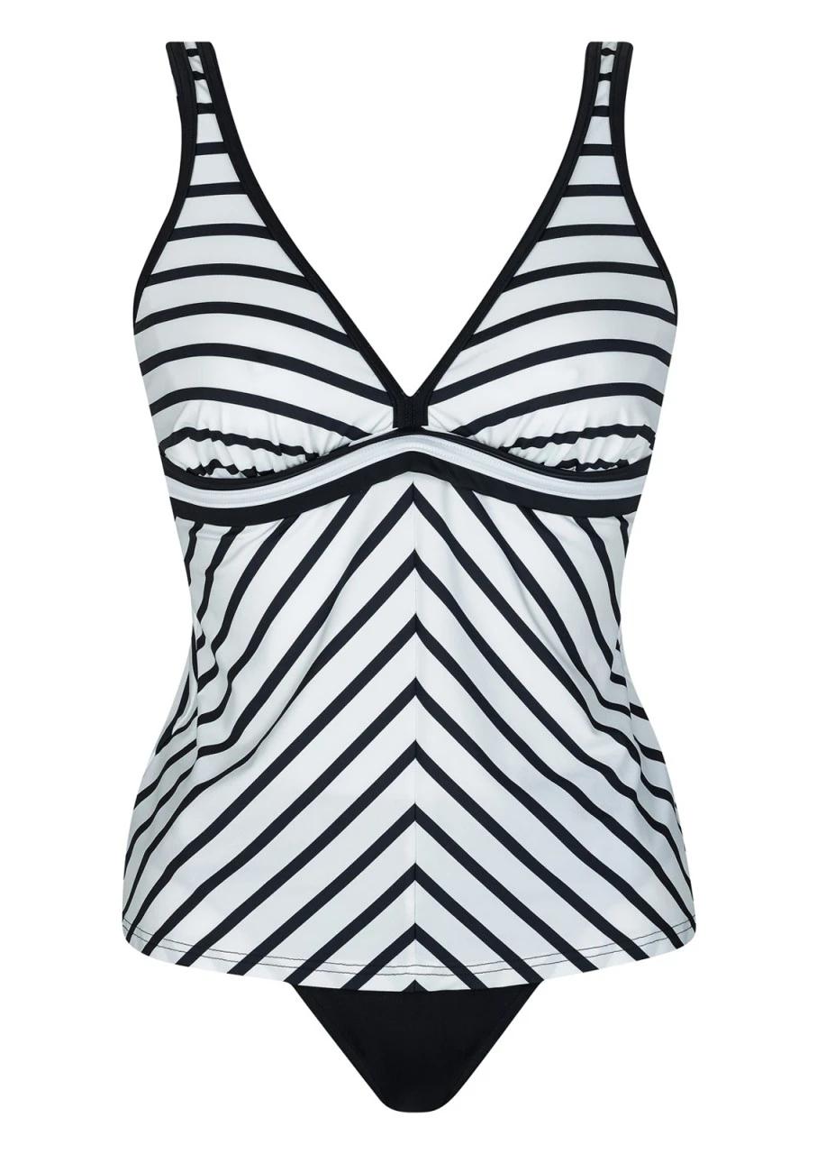 Sehr schöner, bestens tragbarer Tankini in Weiß mit schwarzen Diagonalstreifen. Mit Softstütze und verstellbaren Trägern zum Aushaken. Ein Tankini, der einfach immer passt.