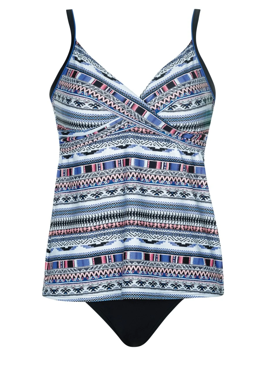 Junges Ethnomuster in Weiß, Blau, Schwarz und Rosa auf schwarzem Grund. Frische Farben für frische Bademode. Tankini mit Softschalen. Die Träger sind aushakbar und verstellbar. Der Slip ist in schlichtem Schwarz gehalten.