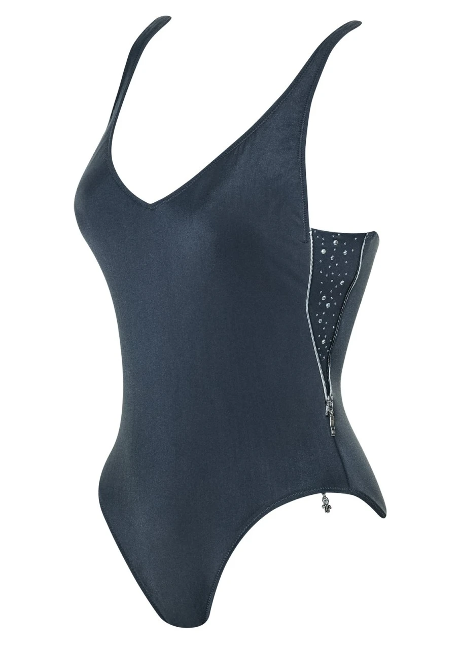 Exquisites Design im grauen Schein! Wunderschöner und zugleich vollkommen schicker dunkelgrauer Stoff. Umrandet wird das ganze Bild mit besetzten Glitzersteinchen, welche die Eleganz noch mehr in den Vordergrund bringen. Badeanzug mit Stützfutter.