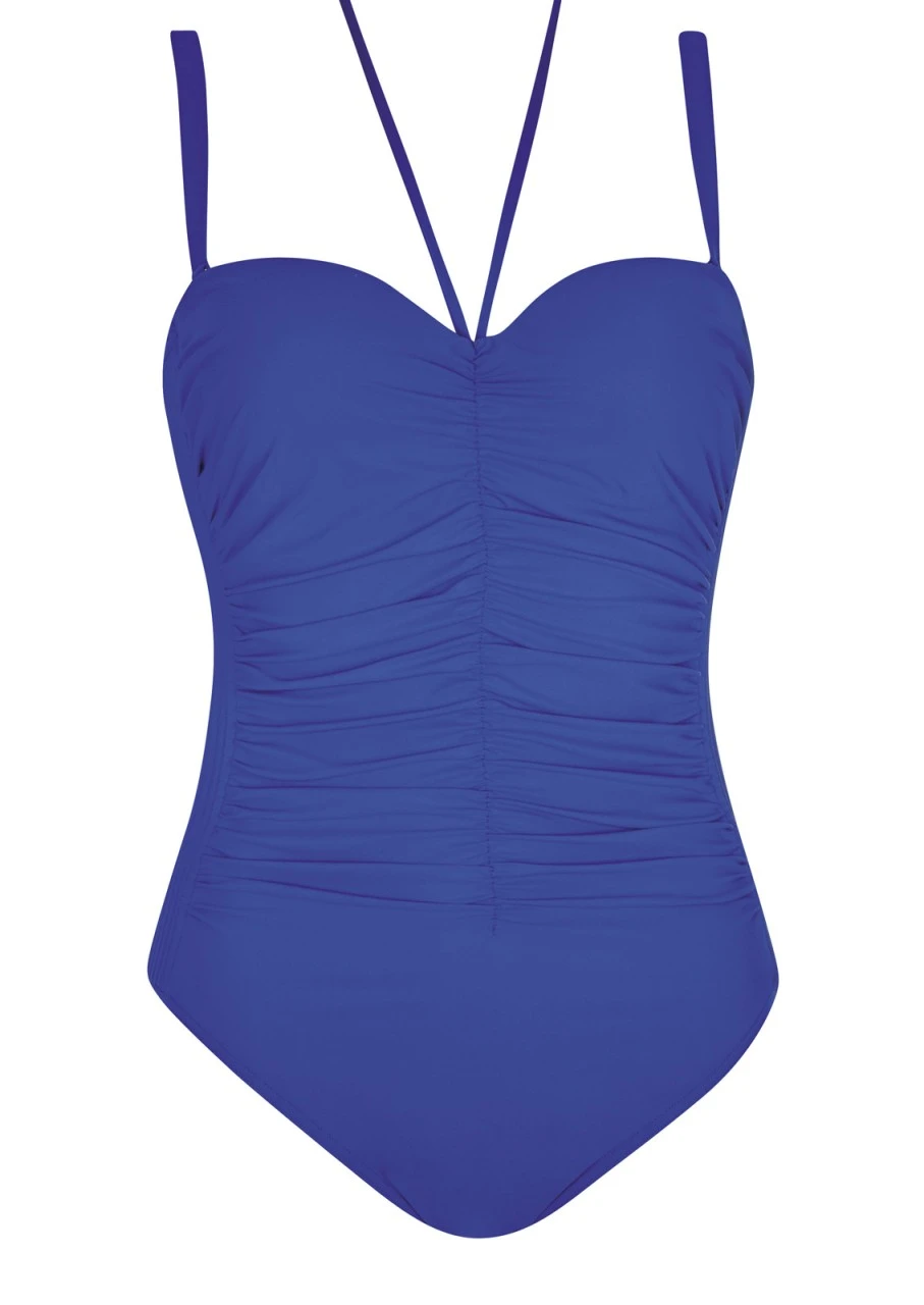 Die pure Eleganz. Unifarbener Bandeau-Badeanzug mit Softschalen und Formbügel in ebenso unaufdringlicher wie überzeugender Optik. Fein gelegte Fältelungen im vorderen Bereich und seitliche Einsätze mit Rippenstruktur ergeben ein Design mit Wow-Effekt. Wahlweise mit abnehmbaren Nackenträger und Schulterträgern. Daher Tragevarianten als Neckholder-, Balconette – oder Bandeau-Badeanzug. Hoher Rückenausschnitt. Erhältlich ist der Einteiler in schmeichelndem Lila oder klarem Türkis.