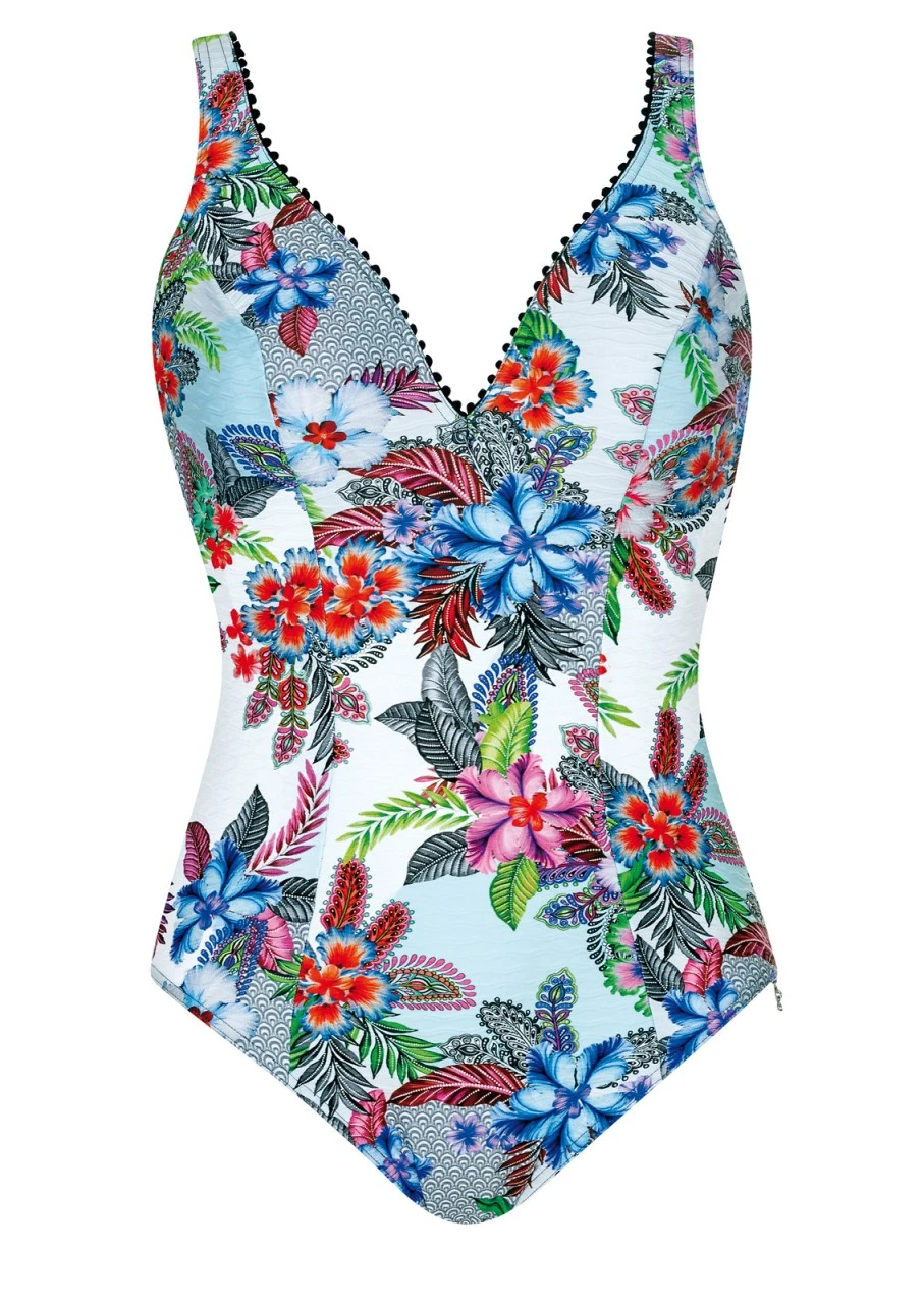 Weiß als Hintergrund für einen spektakulären Blüten- und Blätterprint. Die kräftige Struktur im Material gibt zudem eine unvergleichliche Haptik. Die feine Einfassung des Dekolletés in Schwarz mit kleinen Bommeln rundet das Design ab. Traumhafter Badeanzug mit Softschalen. Die Träger sind verstellbar und aushakbar. Hoher Rückenausschnitt.