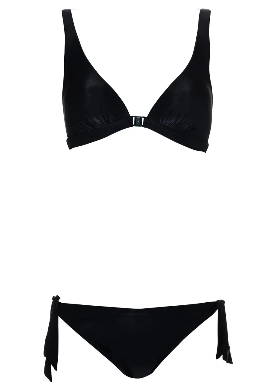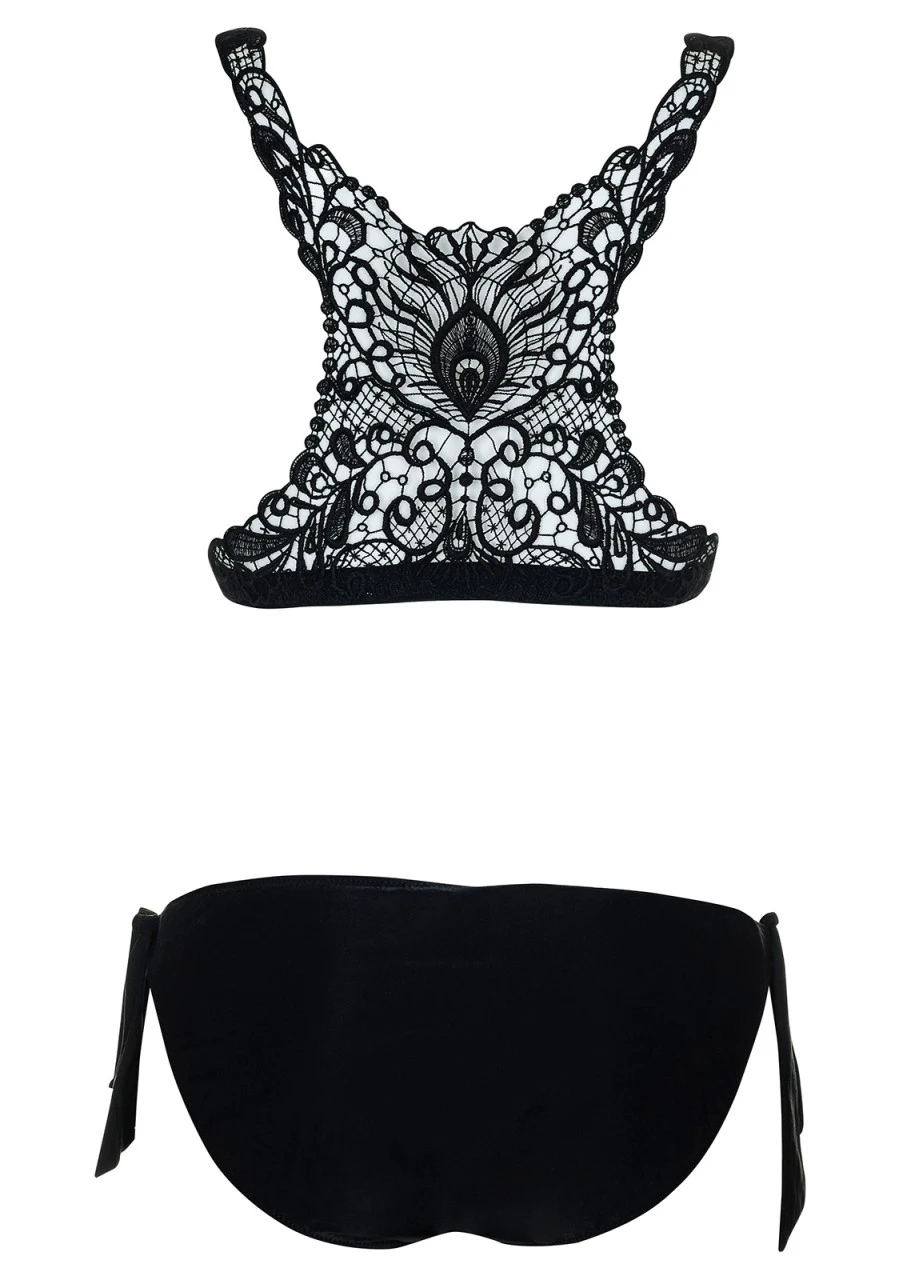 Verführung in Schwarz. So zurückgenommen die Serie im Print ist, so atemberaubend ist sie in den Details der Schnittführung. Bikini und Badeanzug mit einer aufwändigen Trägerlösung am Rücken in zierlicher Spitzen-Optik. Beim Badeanzug im Dekolleté-Bereich noch ergänzt um ein zierliches Band mit feiner Schleife. Die Serie für den „zweiten Blick“.