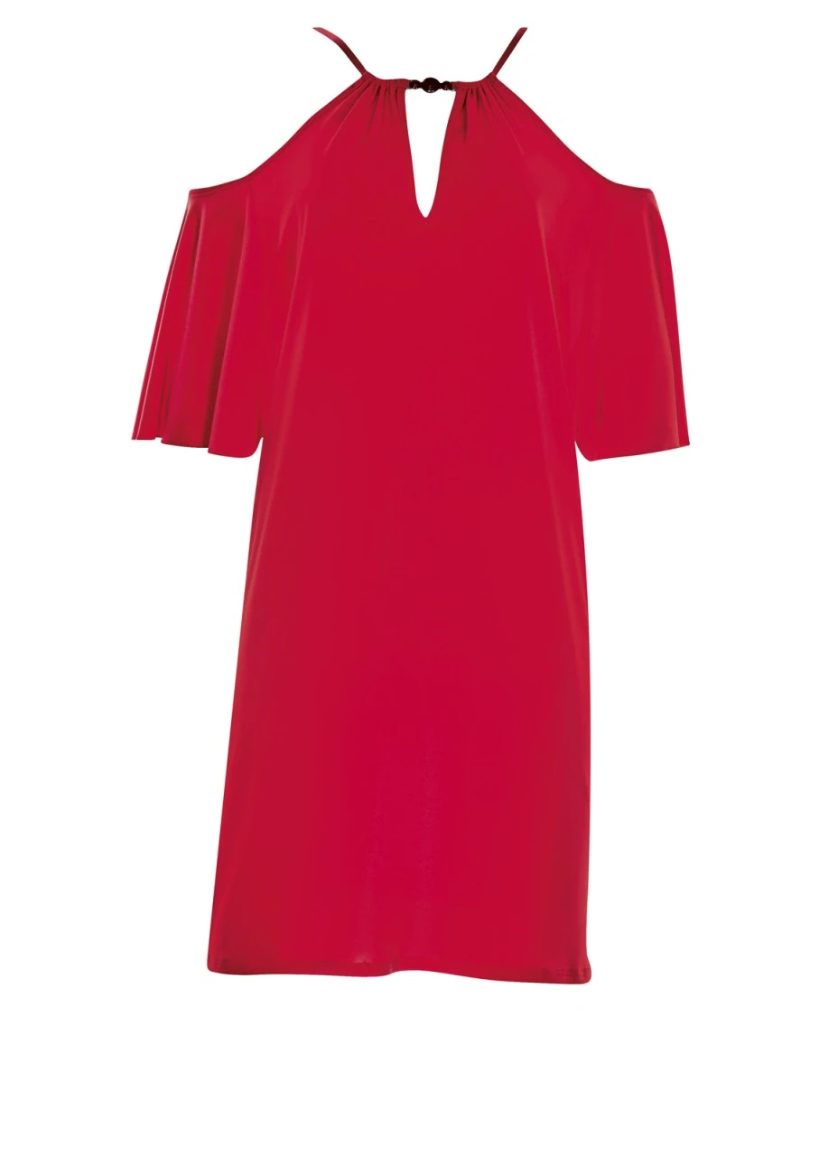Ein Augenschmaus! Schulterfreies Kleid mit ausgeschnittenen Ärmeln in 3/4-Länge und V-Ausschnitt an Vorder- und Rückseite. Tolles Extra ist das schöne Zierteil in Kleiderfarbe. Das Kleid ist im Nacken zu binden.