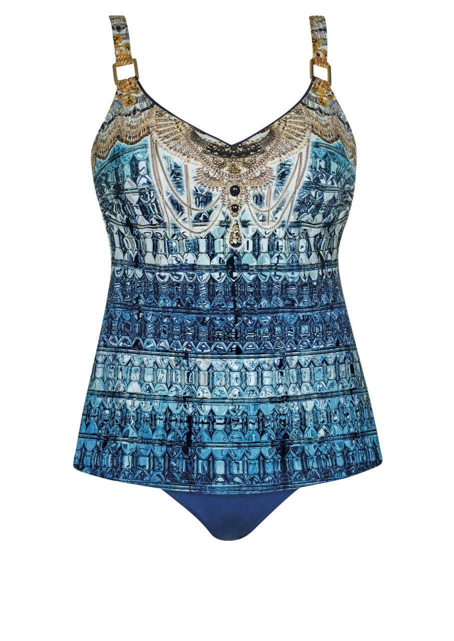 Unwiderstehlicher Print aus Schmuck-, Ketten- und Edelstein-Motiven auf den schönsten Blautönen. Tankini mit Softschalen. Die Träger sind verstellbar und aushakbar. Der unifarbene Taillienslip in der Farbe Blau vervollständigt den Zweiteiler.