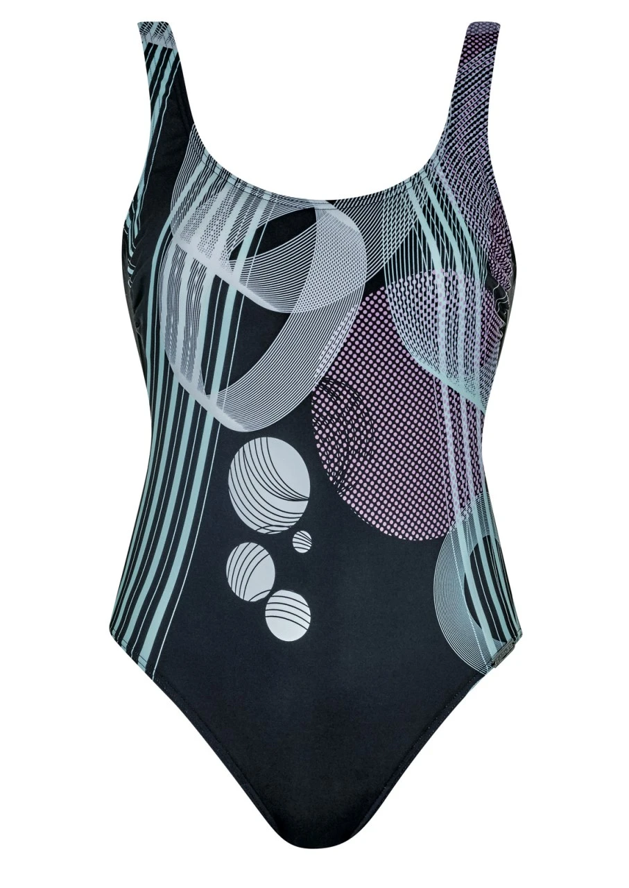 Origineller Print! Grafische Elemente und Linien – Schwarz trifft Weiß, Rosa und Eisblau. Alles zusammen sieht dabei umwerfend gut aus. Badeanzug mit Softschalen und tiefem Rückenausschnitt. Die Rückseite des Einteilers ist in der Farbe Schwarz.