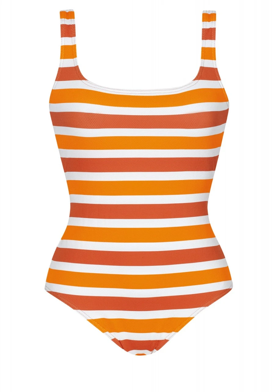 Unser Sommerhit des Jahres! Leuchtorange, Dunkelorange und Weiß in frischer Streifenoptik. Die strahlenden Farben leuchten mit der Sonne um die Wette. Die feine Struktur im Material gibt zudem eine unvergleichliche Optik und Haptik. Badeanzug mit Futterstütze und einem tiefen Rückenausschnitt. Der Einteiler ist komplett gefüttert. Durch diese Vollfütterung garantiert der Einteiler zusätzlichen Halt und ist besonders blickdicht. Nachhaltige Bademode: OLYMPIA® GOES NEXT LEVEL – Bademode aus recyceltem Material.