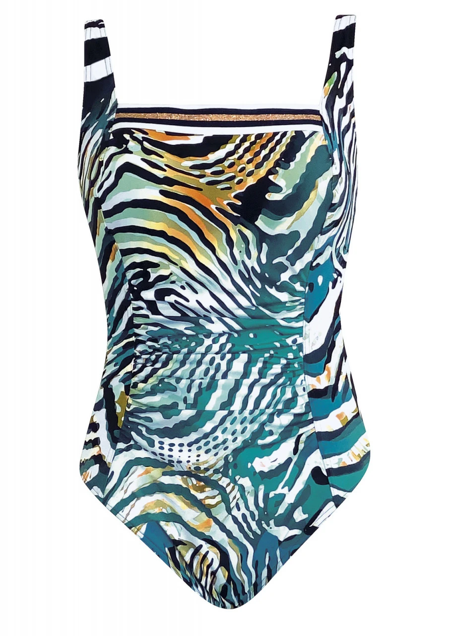 Animal Print neu in Szene gesetzt! Spektakulärer, farbiger Zebraprint. Ein Druck mit Wow-Effekt. Mastectomy-Badeanzug mit Softschalen. Beidseitige Taschen ermöglichen das Einschieben der Prothesen und schützen sie vor Herausfallen. Das höher geschlossene Dekolleté ist mit einem elastischen, gestreiften Zierband versehen. Der Badeanzug ist komplett gefüttert, durch diese Vollfütterung garantiert der Einteiler zusätzlichen Halt und ist besonders blickdicht. Durch die leichten Raffungen an der Vorderseite ist der Badeanzug zudem besonders trage- und figurfreundlich. Die Träger sind verstellbar und am Rücken aushakbar. Hoher Rückenausschnitt.