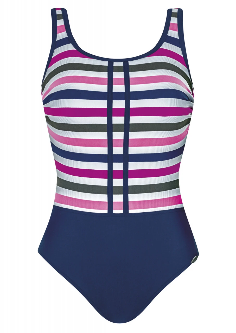 Der Sommer ist einfach easy! Unkompliziertes Streifendesign in Weiß, Blau, Pink, Purpur und Khaki – so schön und einfach wie der Sommer. Die kräftige, gerippte Struktur im Material gibt eine unvergleichliche Optik und Haptik. Mastectomy-Badeanzug mit Softschalen. Das höher geschlossene Dekolleté sorgt für einen sicheren Sitz und der Brustansatz bleibt unsichtbar. Beidseitige Taschen ermöglichen das Einschieben der Prothesen und schützen sie vor Herausfallen. Die Träger sind verstellbar. Das unifarbene Höschenteil und die Einsätze sind aus glattem Material. Somit ergibt sich eine unwiderstehliche Kombination zweier Materialen. Tiefer Rückenausschnitt.