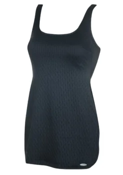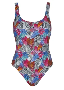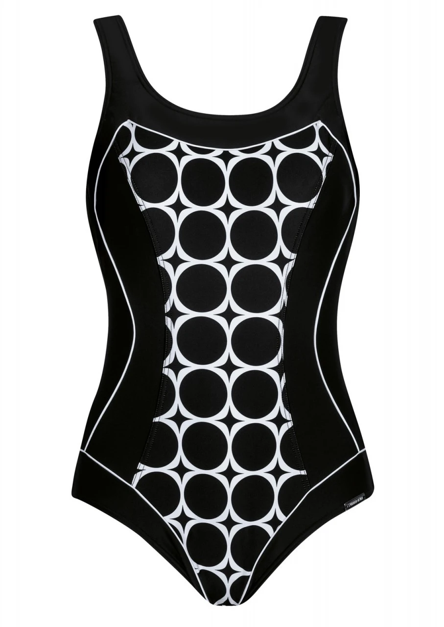 Badeanzug mit Futterstütze und verstellbaren Trägern in klassischem Schwarz. Der gemusterte Einsatz an der Vorderseite unterstützt optisch die Figur. Tiefer Rückenausschnitt.