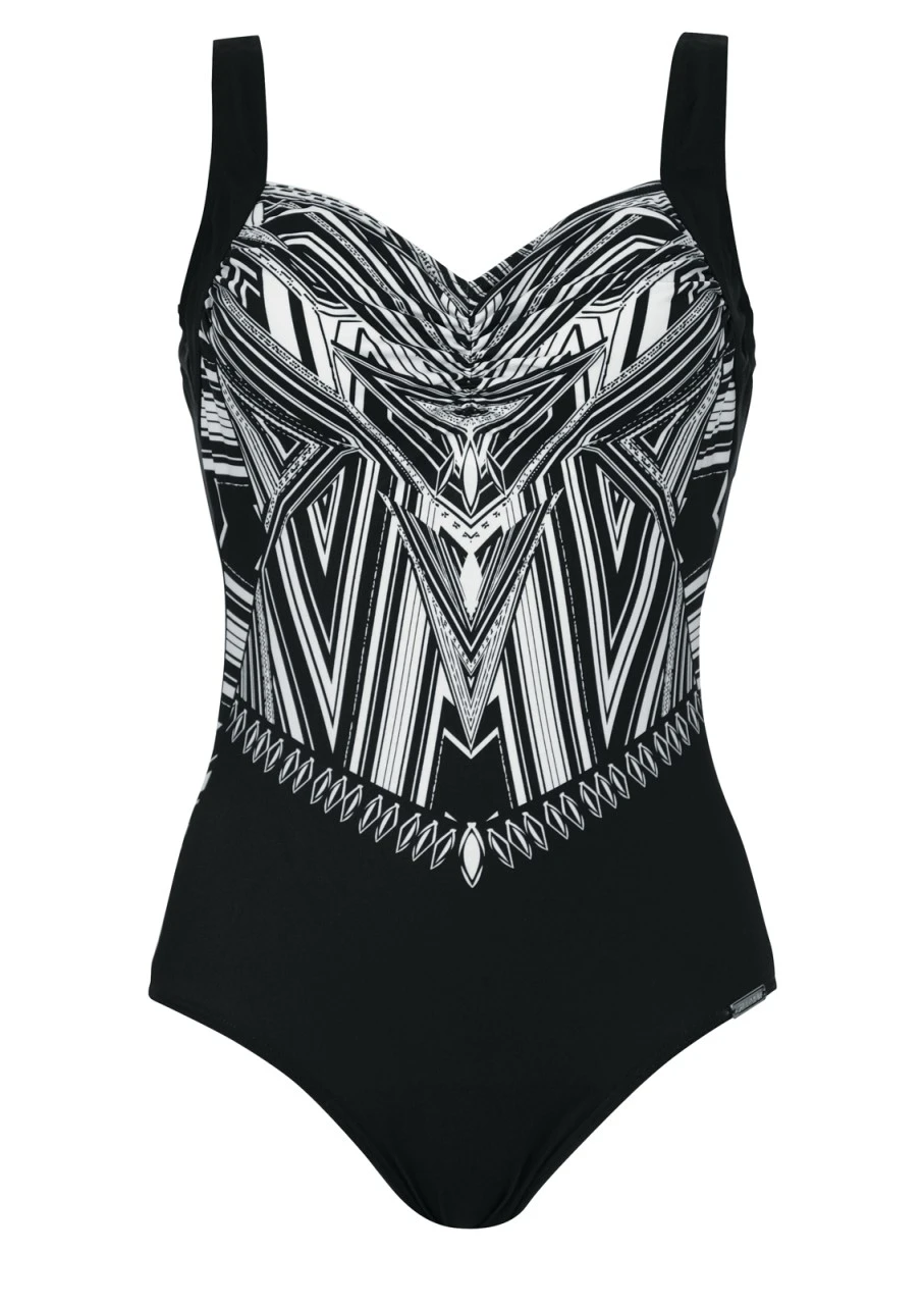 Schickes Grafikdesign in Schwarz/Weiß! Badeanzug mit Softschalen. Das dezent geraffte Büstenteil setzt feminine Akzente. Das raffinierte Dessin unterstützt optisch Ihre Figur. Angesetzte Träger bieten einen besonders hohen Tragekomfort. Die Rückseite des Einteilers hat einen tiefen Rückenausschnitt und ist in der Farbe Schwarz.