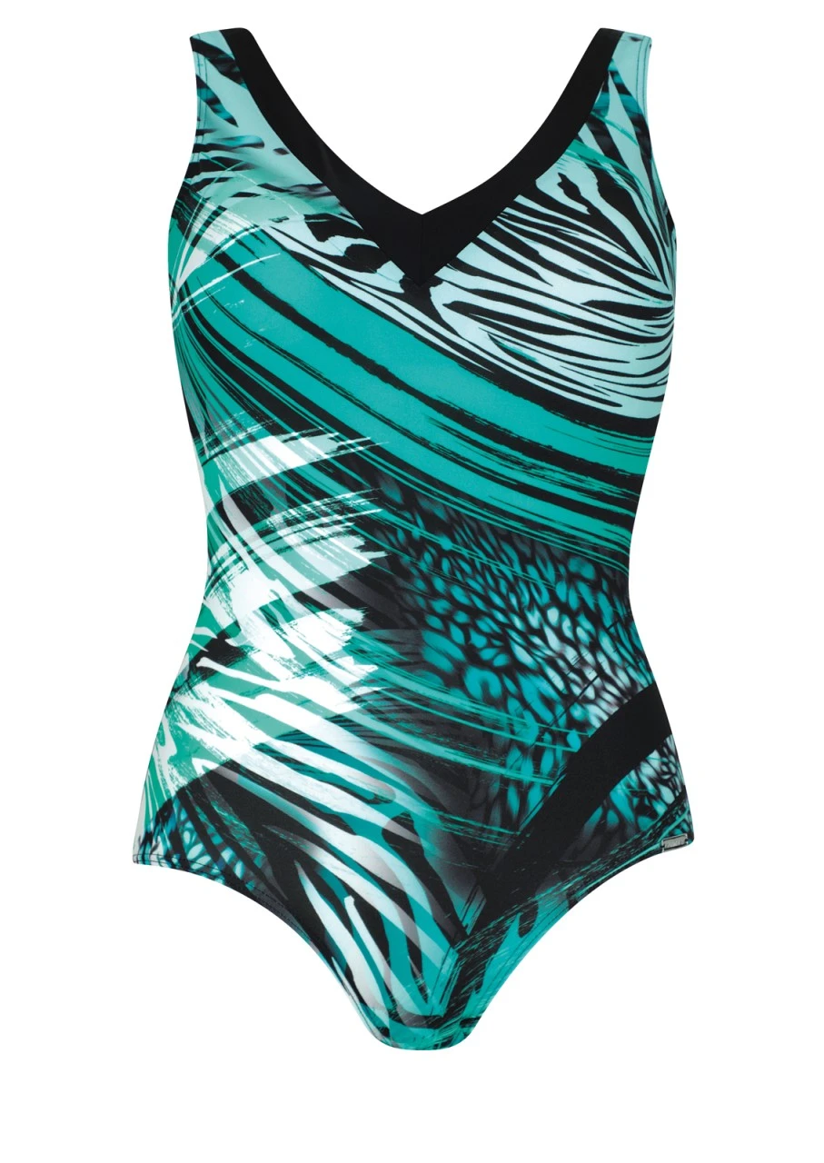 Diagonalstreifen in leuchtenden Türkistönen sind in dramatischer Art ineinander verwoben. Ein sensationelles Design. Der schwarze Hintergrund verleiht dem Farbspiel zusätzliche Brillanz. Badeanzug mit Softschalen und stützender sowie formender Halbcorsage. Das raffinierte Dessin unterstützt optisch die schmeichelnde Funktion der Halbcorsage. Das Dekolleté ist durch die eingesetzte Blende dezent, elegant und ohne tiefen Ausschnitt. Die Rückseite des Einteilers hat einen tiefen Rückenausschnitt und ist in der Farbe Schwarz.