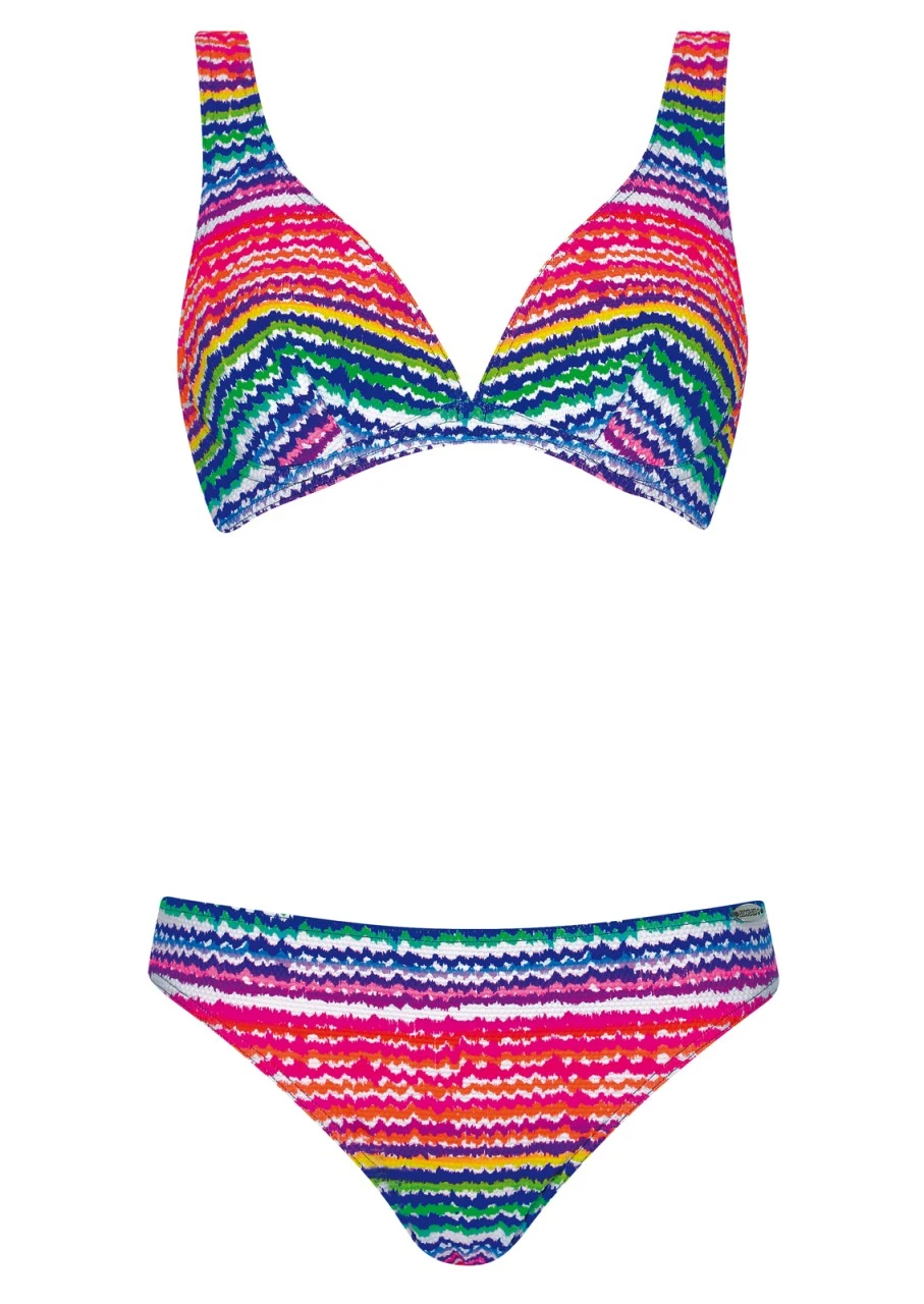 Bunt, jung und frisch, das sind die Attribute dieser Serie. Freche, leicht verwaschene Streifen in knalligen Farben – damit sind Sie ein echter Blickfang am Pool oder Strand. Die feine Struktur im Material unterstreicht das Design und gibt zudem eine unvergleichliche Haptik. Bikini mit Formbügel. Die eingearbeitete Petticoatstütze formt und stützt sanft die Brust. Damit das Top perfekt passt, sind die etwas breiteren Träger in der Länge verstellbar. Die schmale Hüfthose vervollständigt das Bikini-Set. Nachhaltige Bademode: Das Polyamid für den Oberstoff ist zu 100 % aus recycelten Fasern.