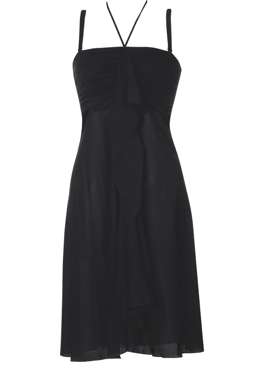 Vielseitiges Kleid mit schönem Volant an der Vorderseite und wahlweise abnehmbarem Nackenträger oder Schulterträgern. Schönes Kleid für Freizeit und Reise.