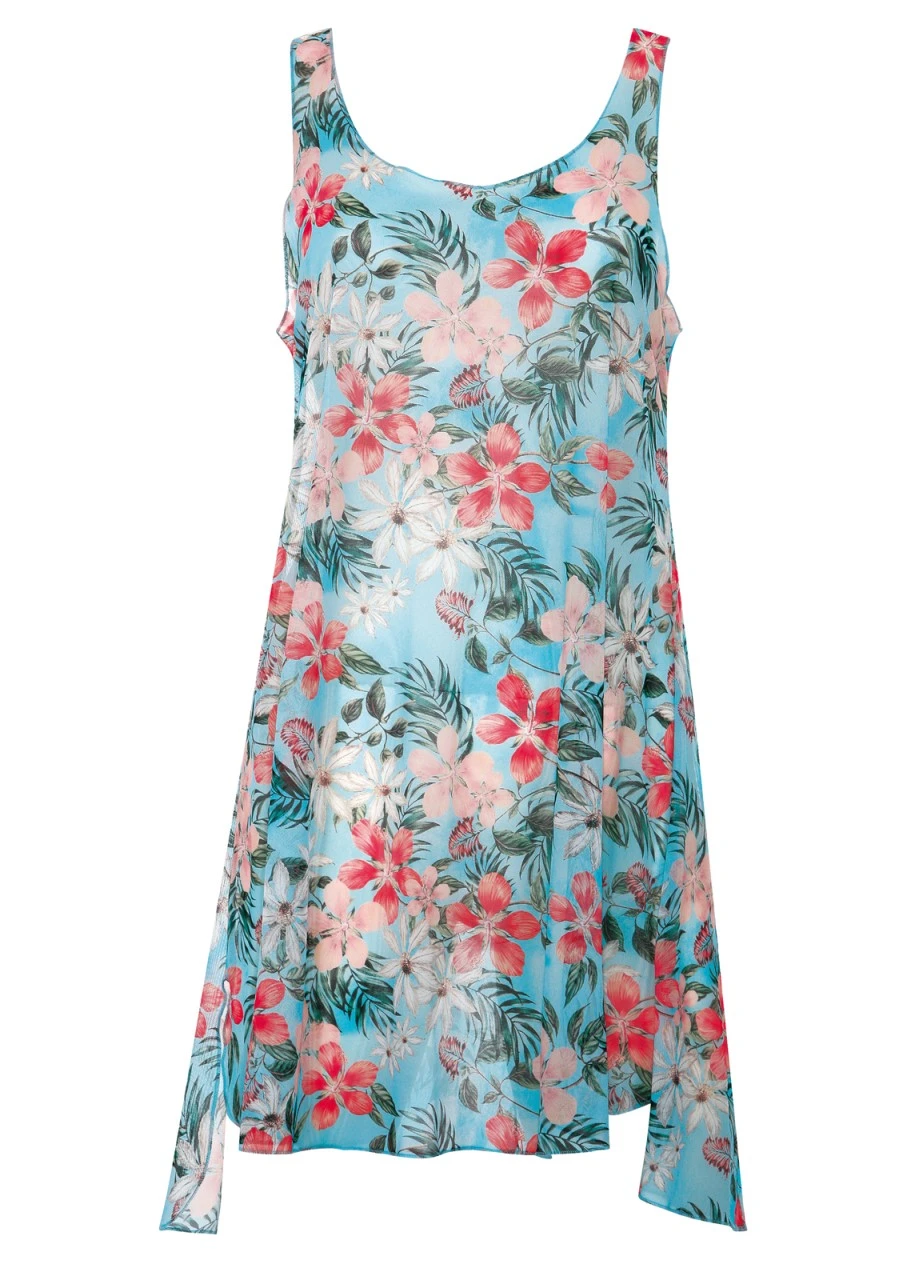 Wundervoller Hawaiiprint mit tropischen Blumen und Palmblätter auf zartem Himmelblau. Ein romantisches und feminines Design, dass Sie sofort in Urlaubsstimmung bringt. Bezauberndes Mini-Kleid mit Rundhals-Ausschnitt und leichter A-Form. Das semitransparente, figurumspielende Kleid besticht durch seine Leichtigkeit und ist ein perfektes Cover-up für Strand, Pool oder Beachbar.
