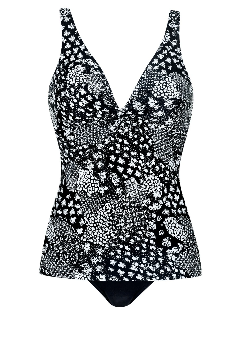 Nachtblau mit süßem, vielfältigem Druck in Weiß. Tankini mit Softschalen. Die Träger sind in der Länge verstellbar und am Rücken aushakbar. Der unifarbene Taillenslip garantiert optimalen Sitz.