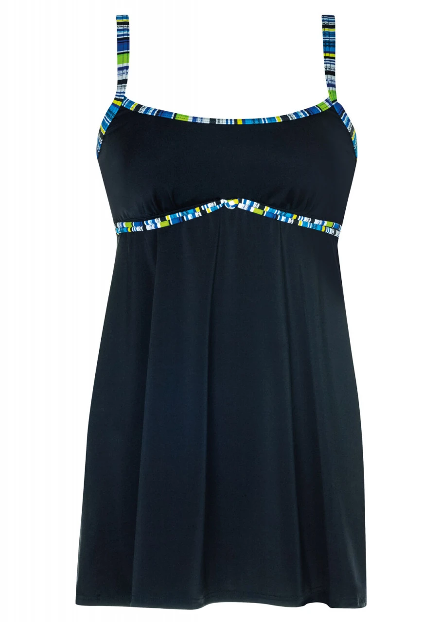 Klassisches Schwarz trifft fröhliches Streifendesign. Tankini mit Softschalen. Gestreifte Zierbänder am Top sorgen für den modischen Akzent. Durch die überdurchschnittliche Länge des Tops wirkt der Tankini wie ein süßes Badekleid, das gekonnt Rundungen kaschiert und der Figur schmeichelt. Die Träger sind in der Länge verstellbar und an der Rückseite aushakbar. Der unifarbige Taillenslip hat eine breite Seitenhöhe.