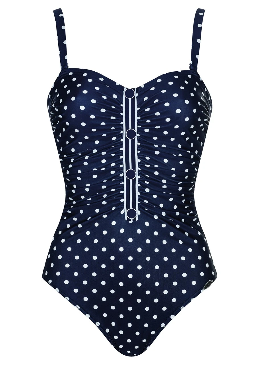 Fifties meet Modern Times! Weiße Dots auf dunkelblauem Grund – klingt bekannt, ist ganz neu! Süßer Badeanzug mit Softschalen und verstellbaren Trägern zum Abnehmen. Der Clou: eingesetzte Knopfleiste auf weißen Streifen. Dadurch entsteht eine figurfreundliche Raffung.