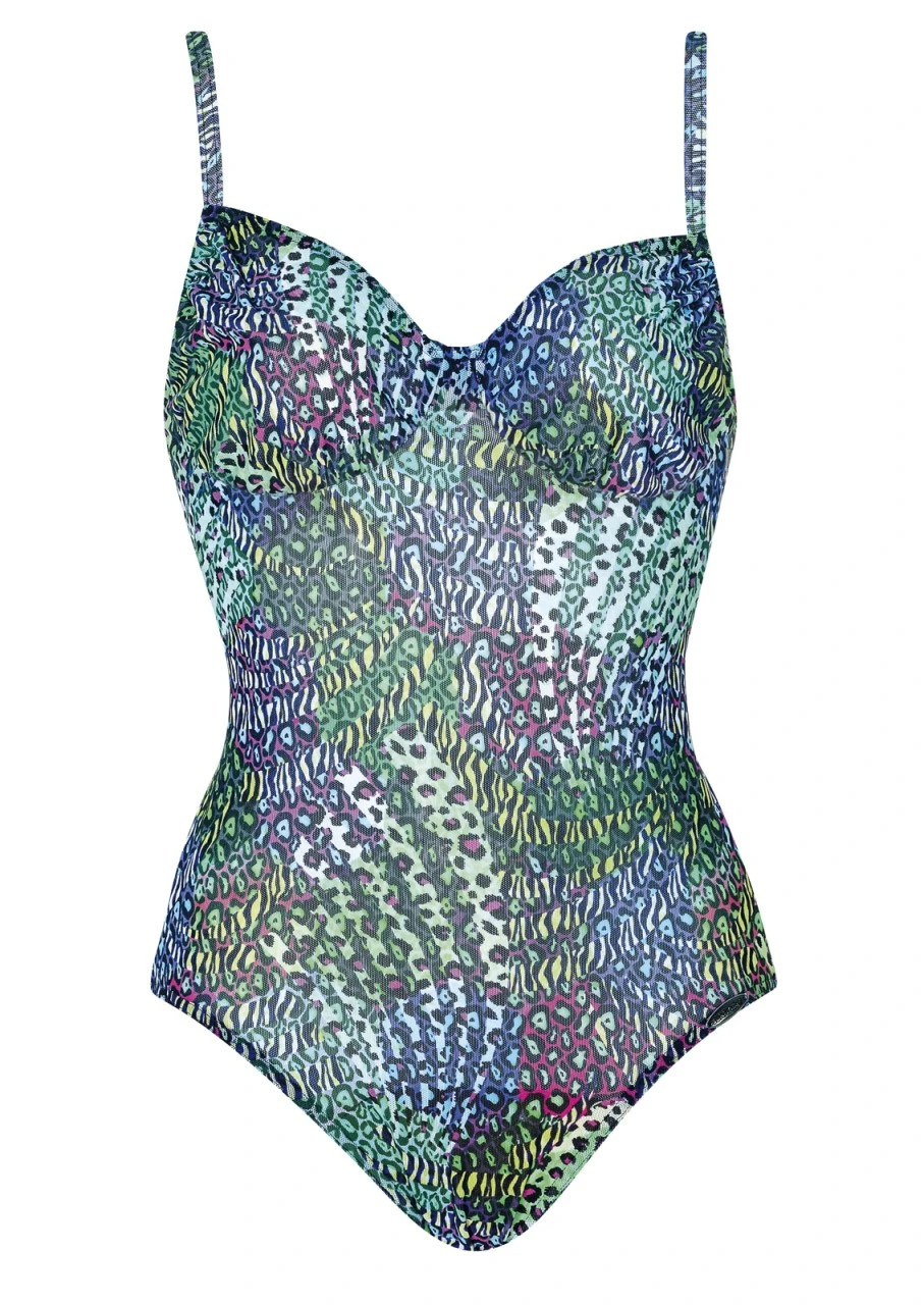 EVEN TAN – eine ganz besondere Serie mit einem einmaligen Effekt! Der Clou ist ein besonderes Material mit einer wabenförmigen Struktur – etwa wie ein sehr, sehr feines Netz. Dank der mikrofeinen Waben und durch den aufwändigen, kontrastreichen Druck ist das Material auch im nassen Zustand absolut blickdicht, lässt aber die Sonnenstrahlen dennoch durch! Badeanzug mit gearbeitetem Büstenteil.