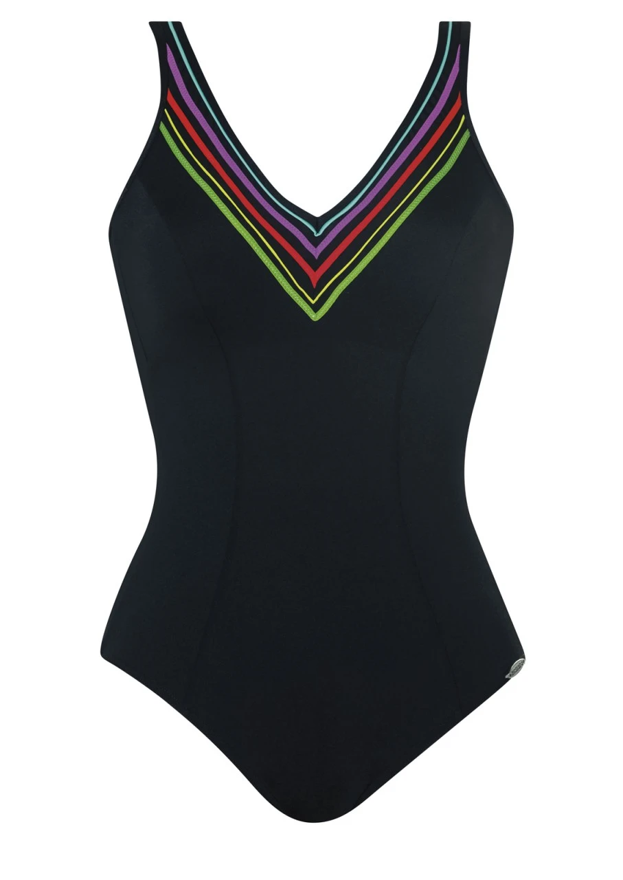 Für die Schwimmerin. Schwarzer Badeanzug mit Softschalen. Die Zierbänder in Regenbogenfarben am V-Ausschnitt geben dem Einteiler einen Frischekick. Der tiefe Rückenausschnitt in V-Form ist ebenso mit den Zierbändern versehen. Der Einteiler ist aus einem chlorresistenten Material gefertigt.