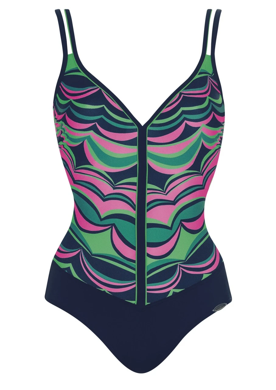 Blau, Grün, Pink. Als klare Color Blockings in grafischer Wellenform. Badeanzug mit Softschalen und feinen Doppelträgern.