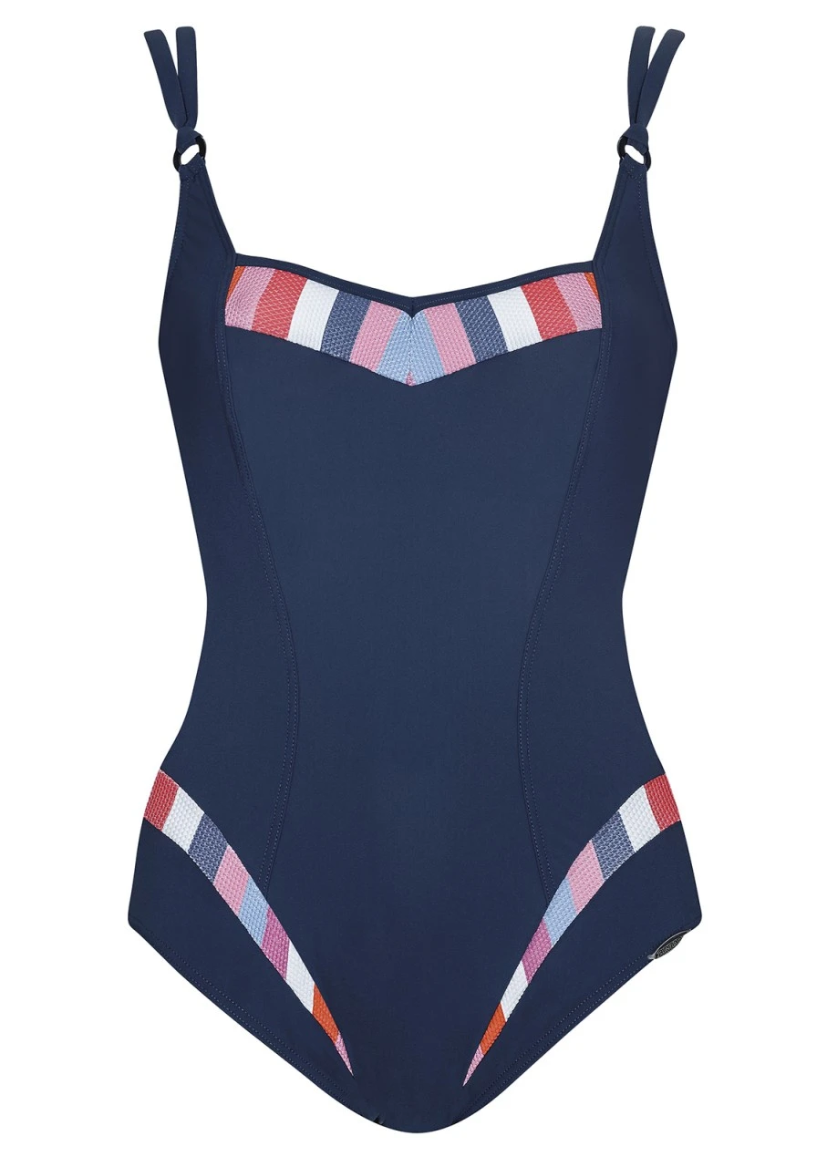 Unser Sommerhit des Jahres! Absolut trendige Farben: Stahlblau, Softpink, Leuchtorange und Weiß in frischer Streifenoptik. Die kräftige Struktur im Material gibt eine unvergleichliche Haptik. Toller Shapewear-Badeanzug, der das Design mit einem kräftigen, dezent figurformenden Uni kombiniert. Der Einteiler mit Petticoatstütze besteht aus LYCRA® BEAUTY Stoff, der Formkraft und Komfort gewährleistet.