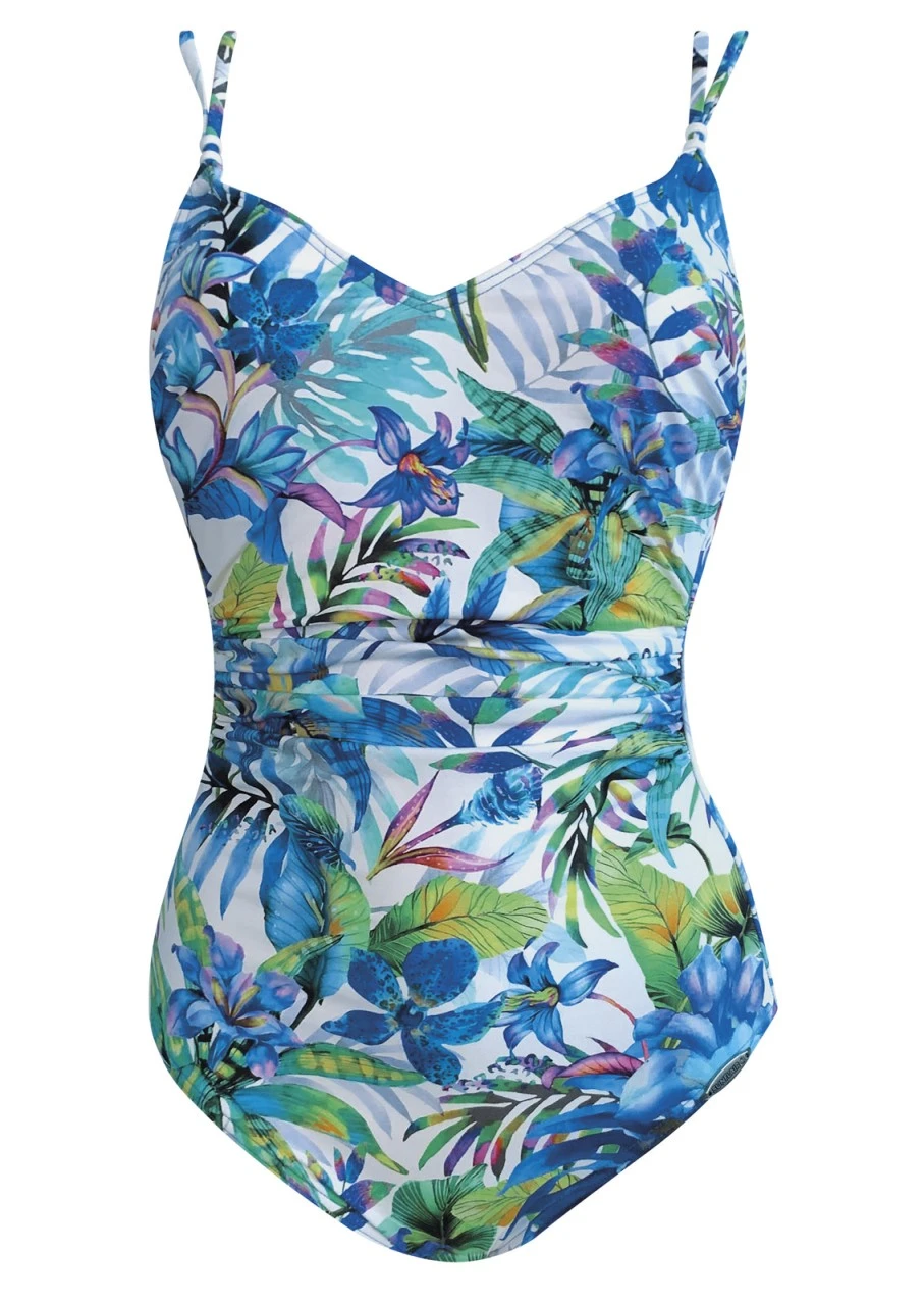 Herrliche Blüten und Blätter in Grün, Blau, Gelb und Violett auf strahlendem Weiß. Ein Design, so schön wie eine sanfte Sommerbrise. Badeanzug mit Formbügel. Die doppelten Träger sind verstellbar. Besonders trage- und figurfreundlich durch die leichten Raffungen an der Vorderseite. Tiefer Rückenausschnitt.