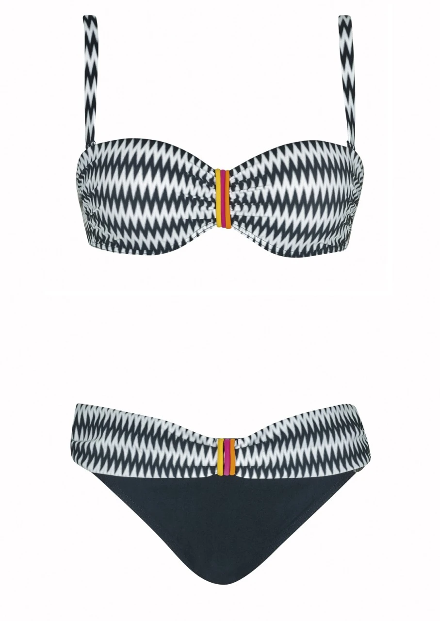 Atemberaubende Ethno-Fantasie! Schmeichelndes, verwischtes Zick-Zack-Muster in Schwarz/Weiß. Die unifarbenen Bänder in Gelb, Pink und Orange geben einen tollen Kontrast zum Design. Bandeau-Bikini mit Softschalen und Formbügel. Die verstellbaren und aushakbaren Träger bieten viele Trage-Varianten: Mit oder ohne Träger, überkreuzt oder im Nacken gebunden. Slip in der Farbe Schwarz mit Blende in Gürtel-Optik.