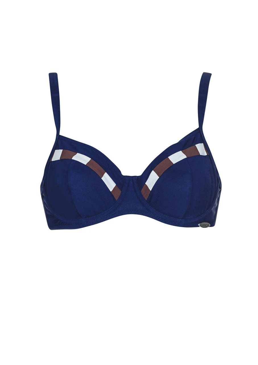 Feines Bikini Top in Nachtblau mit schicken Einsätzen aus braunen und weißen Vertikalstreifen im vorderen Bereich. Mit Formbügel, Stützfutter und verstellbaren Trägern.