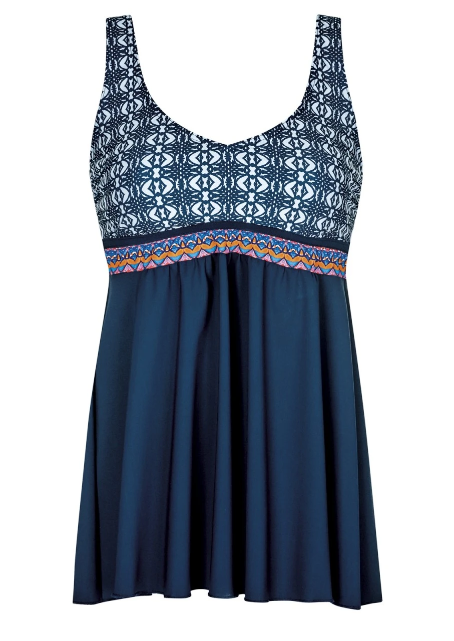 Lust auf süße Bademode? Wir empfehlen die Serie LATIN ART von SUNFLAIR®! Genialer Mix von frischen, fröhlichen Farben und Muster im Ethno Stil. Tankini mit Softschalen. Durch die überdurchschnittliche Länge des Tops wirkt der Tankini wie ein süßes Badekleid, das gekonnt Rundungen kaschiert und der Figur schmeichelt. Die Träger sind in der Länge verstellbar und am Rücken zum Aushaken. Taillenslip mit breiter Seitenhöhe in der Farbe Nachtblau.